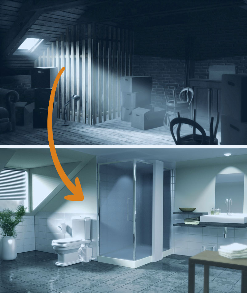 Új élettereket nyerhet a pincében, alagsorban, szuterénben, tetőtérben és minden olyan helyen, ahol a gravitációs lejtéssel nem lehetne mosókonyhát, vécét és fürdőszobát telepíteni.